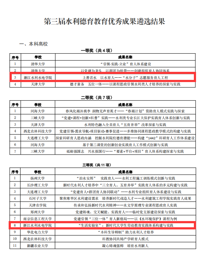 第三届全国水利德育教育优秀成果遴选活动,水利院校积极组织申报,共收到51所水利院校的80项优秀成果,经汇总初审、线上评审、专家评议等程序,遴选出一等奖8项、二等奖16项、三等奖25项,其中本科院校一等奖4项、二等奖7项、三等奖11项。我校团委报送的成果“上善若水 以水育人——‘水分子’志愿服务育人工程”获得一等奖,并与清华大学等一起在第二届水利德育教育研讨会上交流发言;总务处报送的成果“生活实验室:新时代大学生劳动教育实践体系构建与实践”获得三等奖。