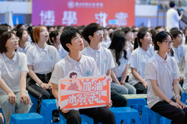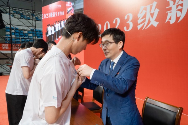党委书记钱天国等校领导为新生代表佩戴校徽。全体新生正式成为了水分子,拥有了共同的名字——水院人。