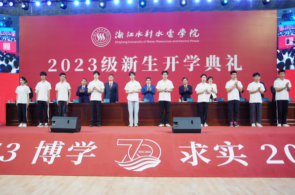 9月17日晚,以“迎七秩  立新人  向未来”为主题的浙江水利水电学院2023级新生开学典礼在南浔校区隆重举行。5002名新生齐聚一堂,以昂扬的青春姿态共同开启崭新的大学生活。全体校领导,南浔区领导,各二级学院、各职能部门主要负责人,辅导员,新生班主任等出席开学典礼。典礼由党委副书记吴小英主持。