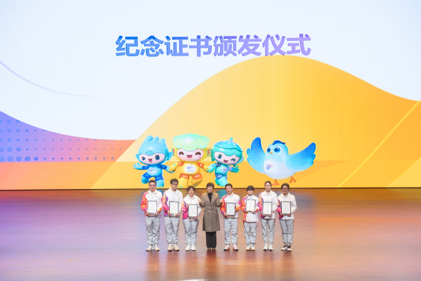 吴小英为志愿者管理团队成员颁发纪念证书。亚运赛会志愿服务领导小组成员为优秀志愿者代表颁发亚运会赛会志愿者纪念物资“小青盒”和优秀志愿者证书。