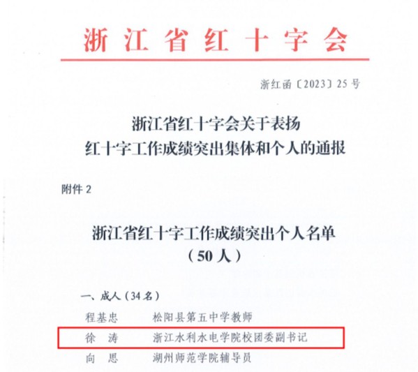 为表扬先进、树立榜样,进一步推动学校红十字会和红十字青少年工作,更好地为推进“两个先行”建设贡献,经省功勋荣誉表彰工作领导小组同意,浙江省红十字会决定对成绩突出的20个集体和50名个人予以通报表扬,校团委徐涛老师获“成绩突出个人”荣誉称号。