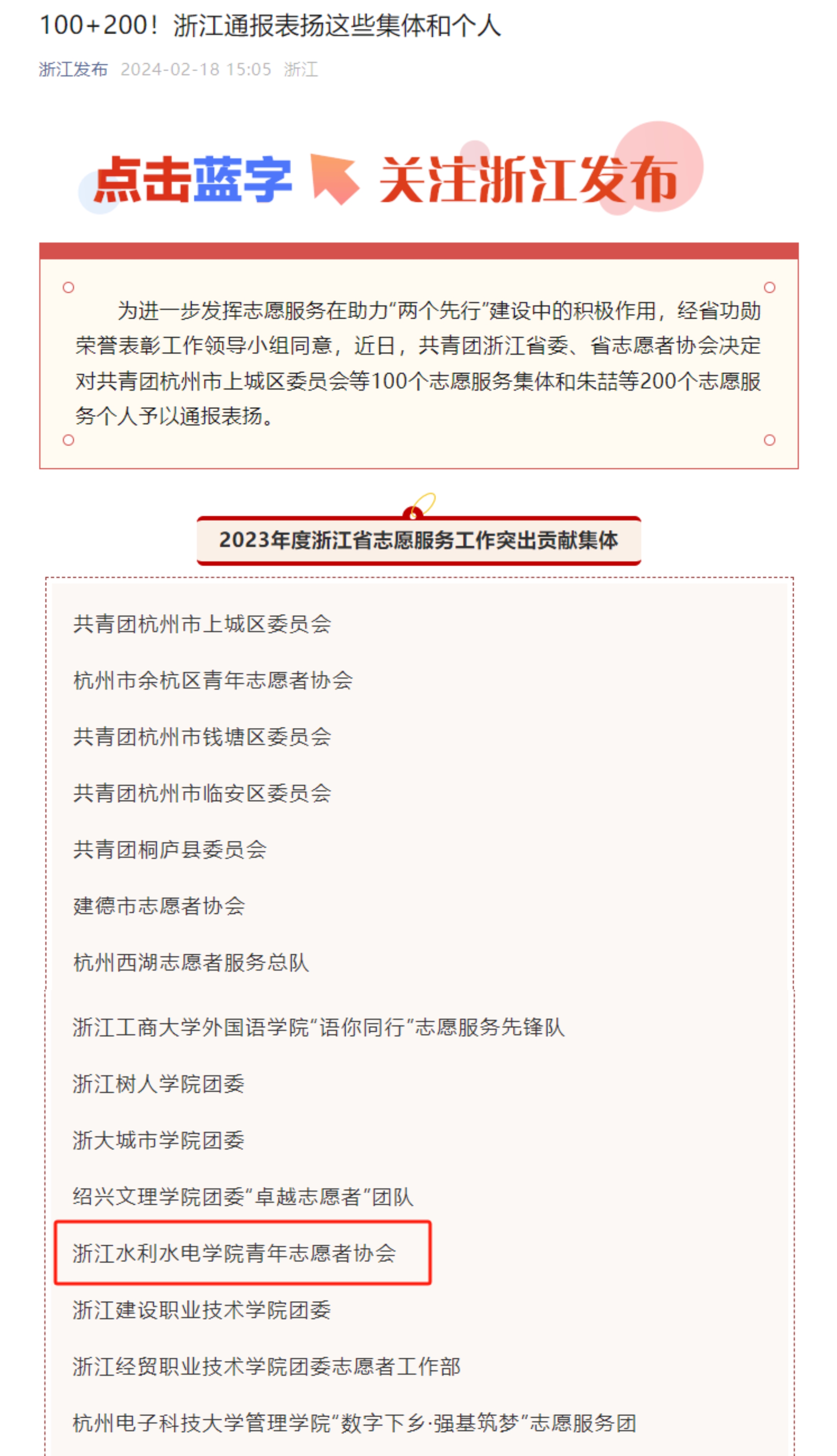 为进一步发挥志愿服务在助力“两个先行”建设中的积极作用,经省功勋荣誉表彰工作领导小组同意,近日,共青团浙江省委、省志愿者协会对全省100个志愿服务集体和200个志愿服务个人予以通报表扬,我校青年志愿者协会获“突出贡献集体”荣誉称号,测绘与市政工程学院任倩倩老师获“突出贡献个人”荣誉称号。