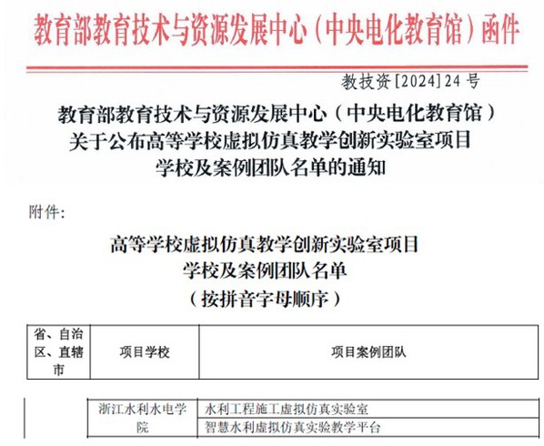 近日,教育部教育技术与资源发展中心(中央电化教育馆)公布高等学校虚拟仿真教学创新实验室项目学校及案例团队名单,共计173所高等学校的325个教学团队获批,我校水环学院王玉强副教授牵头的“水利工程施工虚拟仿真实验室”教学团队和信息学院徐欧官教授牵头的“智慧水利虚拟仿真实验教学平台”教学团队获批项目案例团队。