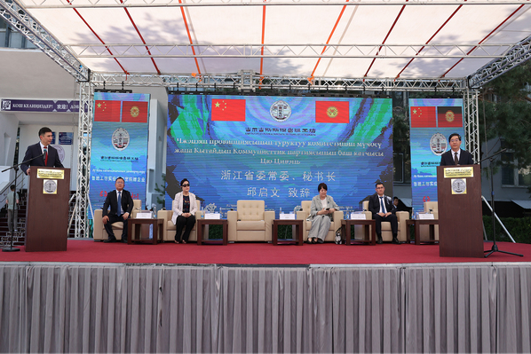 6月27日,由我校牵头建设的吉尔吉斯斯坦鲁班工坊设备捐赠及智慧教室揭牌仪式在吉尔吉斯斯坦国立技术大学隆重举行,标志着吉尔吉斯斯坦鲁班工坊建设取得实质性进展。浙江省委常委、秘书长邱启文,中国驻吉尔吉斯斯坦特命全权大使杜德文,吉尔吉斯斯坦教育科学部部长多克杜尔库尔·肯季尔巴耶娃出席仪式并致辞。吉尔吉斯斯坦外交部萨马特·阿塔什维奇出席仪式并剪彩。